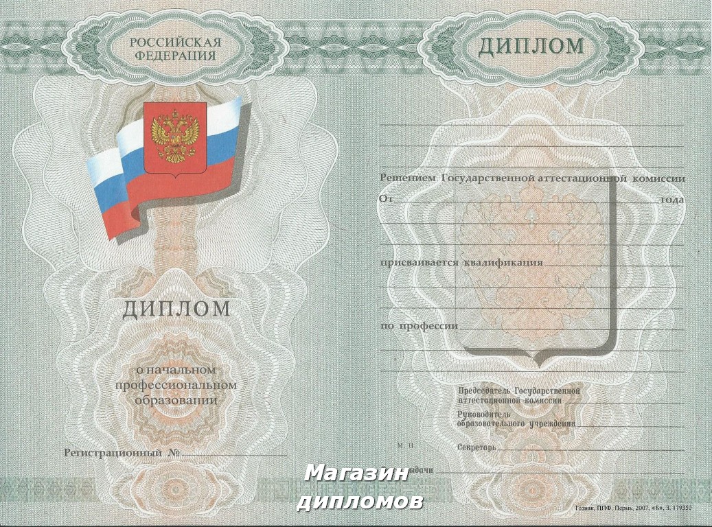 Диплом ПТУ Российской Федерации (Гознак, ППФ, Пермь 2007 год.), выдавался с 2007 года по настоящее время.